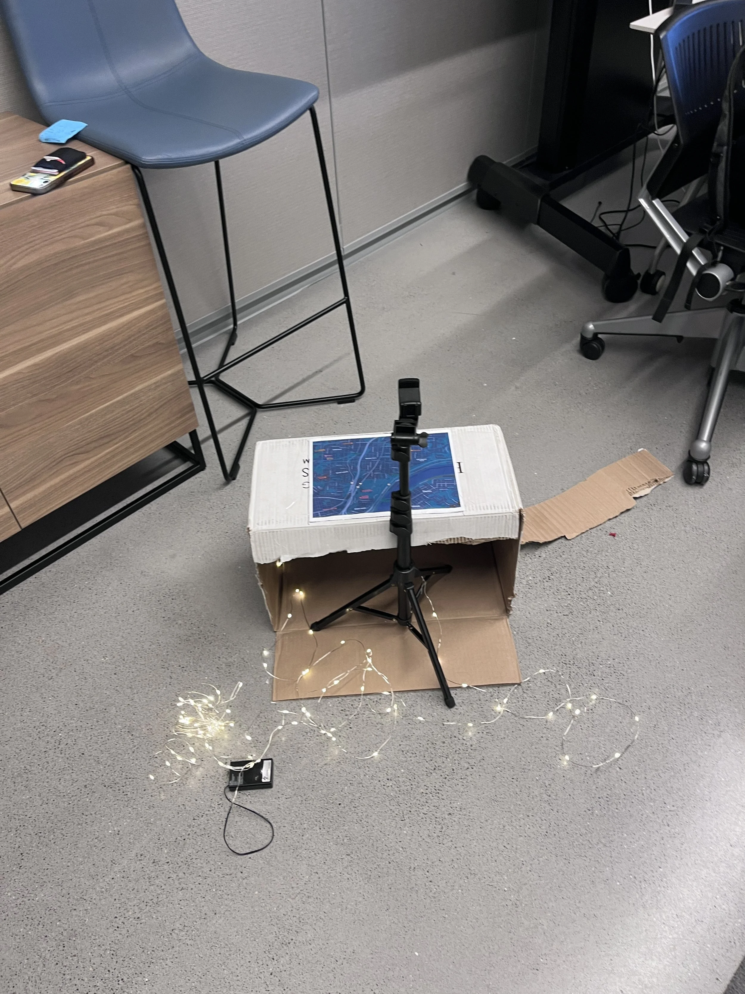 Utilizing a cardboard box and string lights, the team demonstrated how vehicles could move through the city.