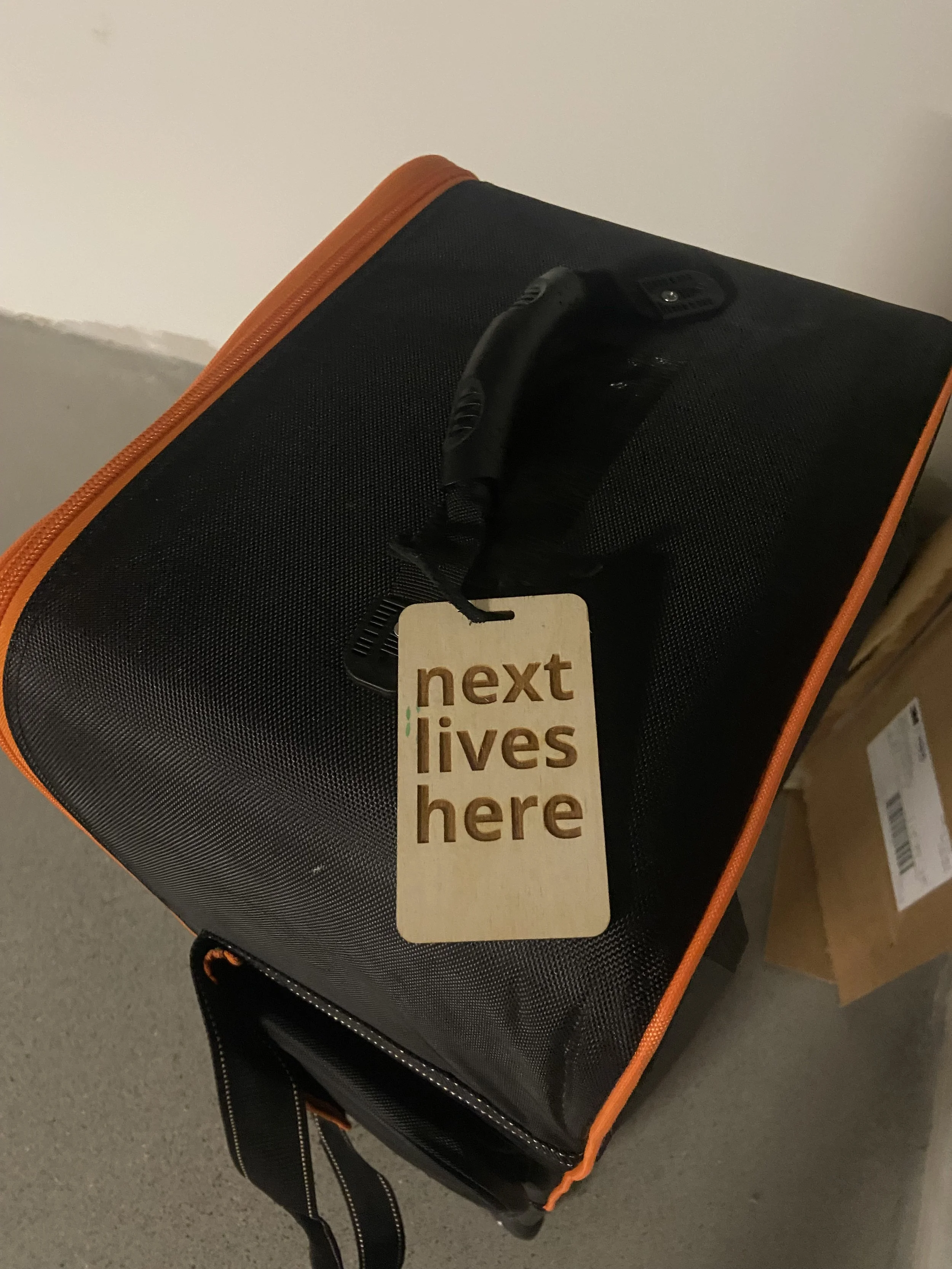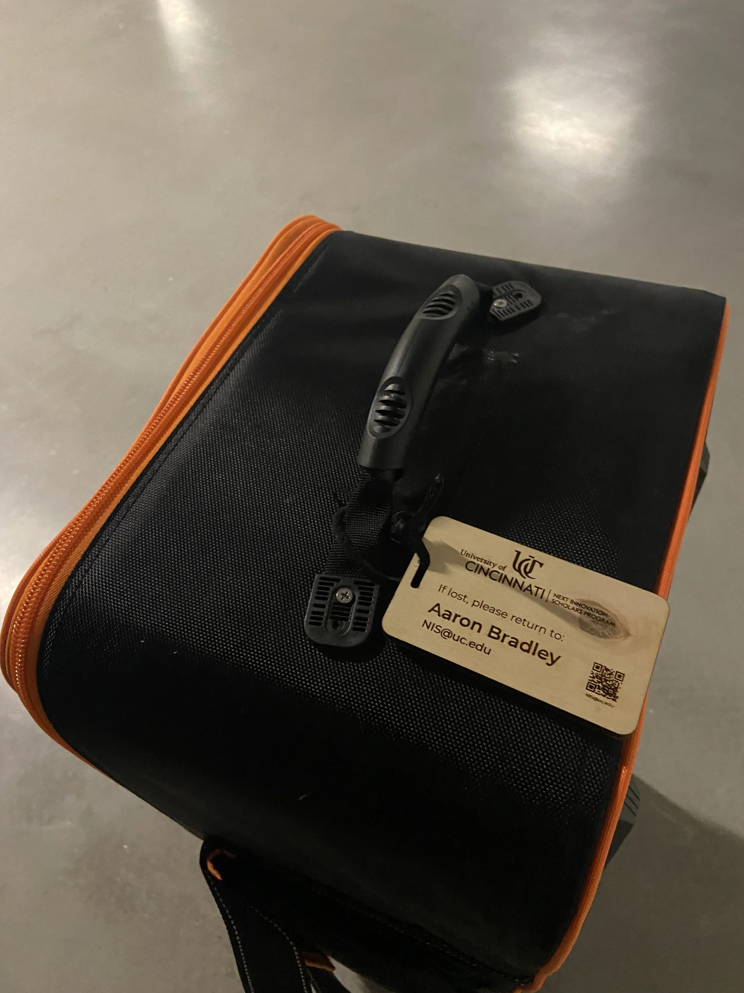 The client expressed a desire to have the bag branded with the NEXT Innovation Scholars program as the main identity. The team played into the University of Cincinnati’s “Next Lives Here” agenda. The wooden tag was made in the 1819 Innovation Hub ground floor makerspace. The tag has a QR code leading straight to the NIS email, making it easy and accessible for others to get in contact with the program. The team also designed potential prototypes for a business card that the client can use.
